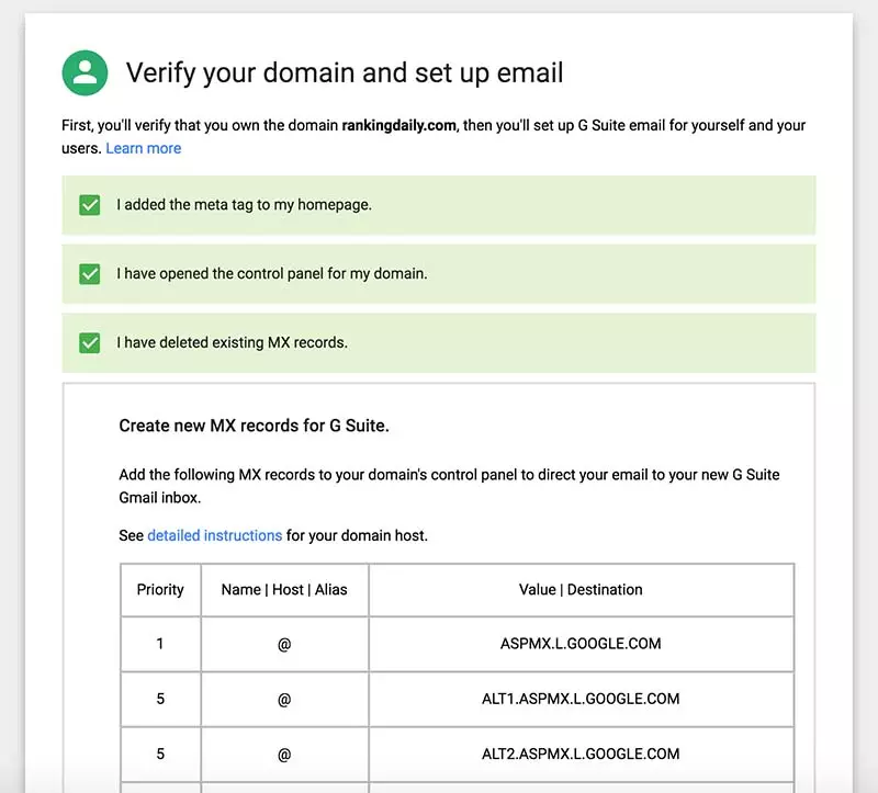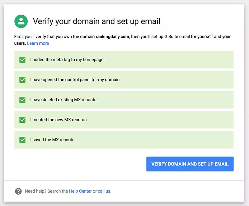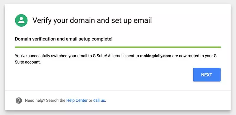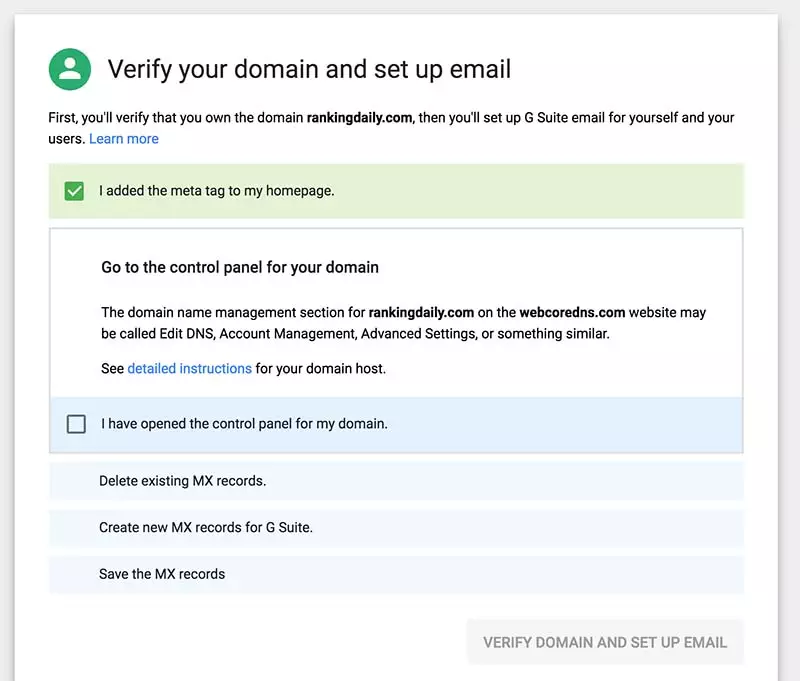 Click the ‘Verify domain and set up email’ to continue button. Once this check is complete you will be presented with the following screen: