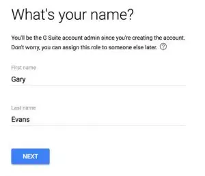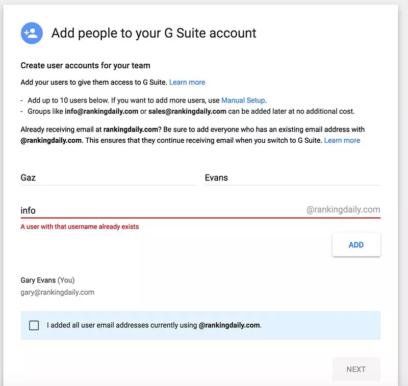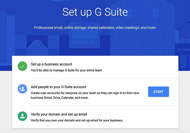 The next screen you are presented is where you start adding people to your G Suite account. Click the ‘Start’ button to proceed.