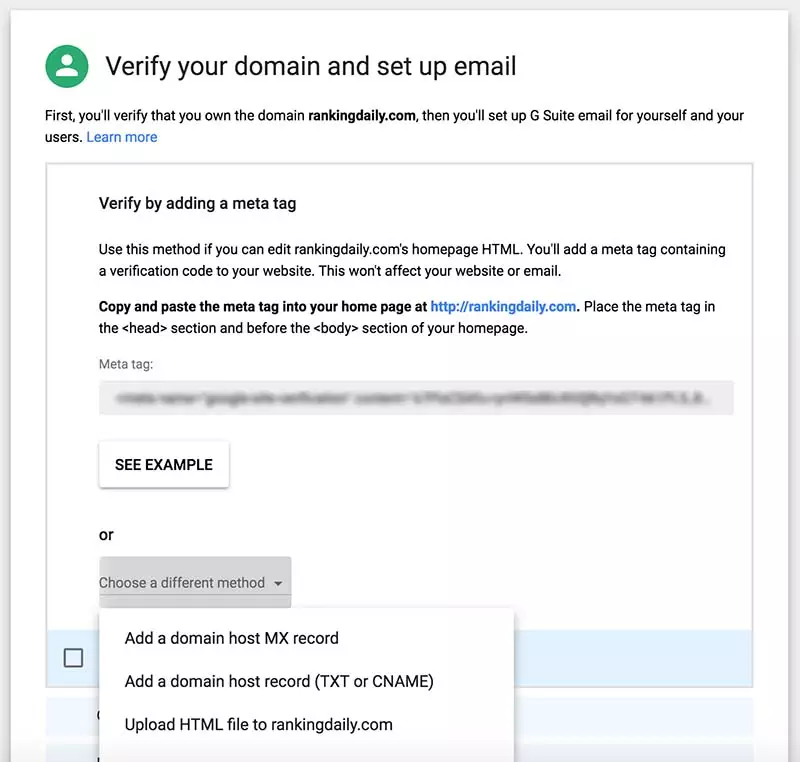 At this point, you need to verify to Google that you have access to the domain name you entered in the previous sections so there is some quick work required on the website hosting site to make this happen. The screen below presents you with a few options:
